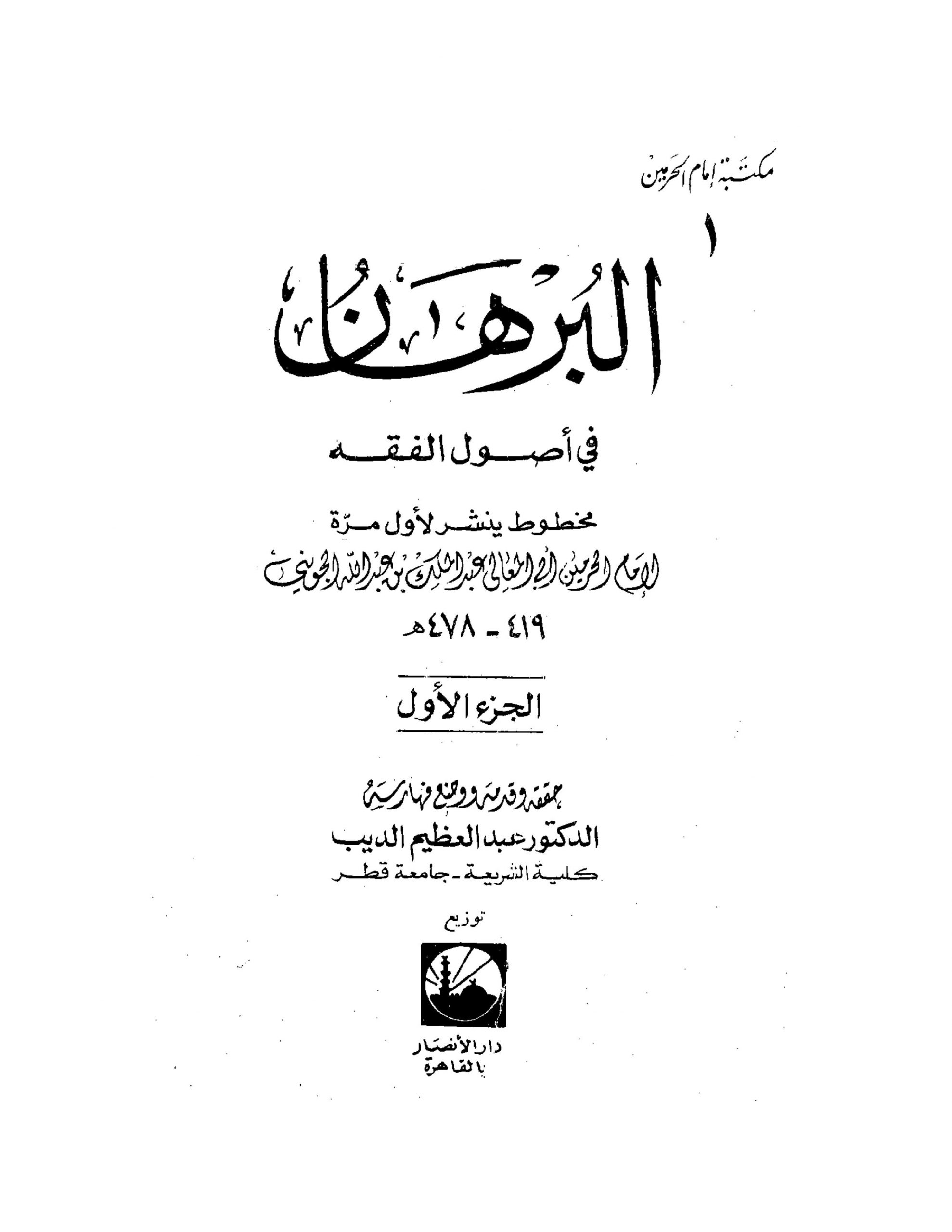 البرهان فی اصول الفقه نویسنده: امام الحرمین ابوالمعالی الجوینی محقق/مصحح: الدکتور عبدالعظیم الدیب البرهان فی اصول الفقه